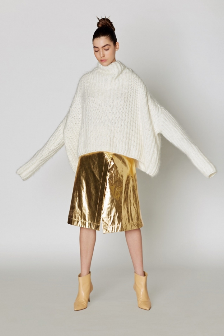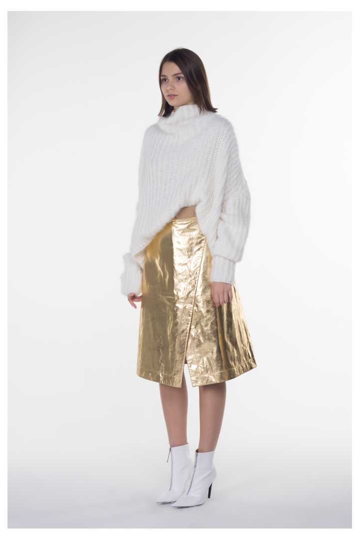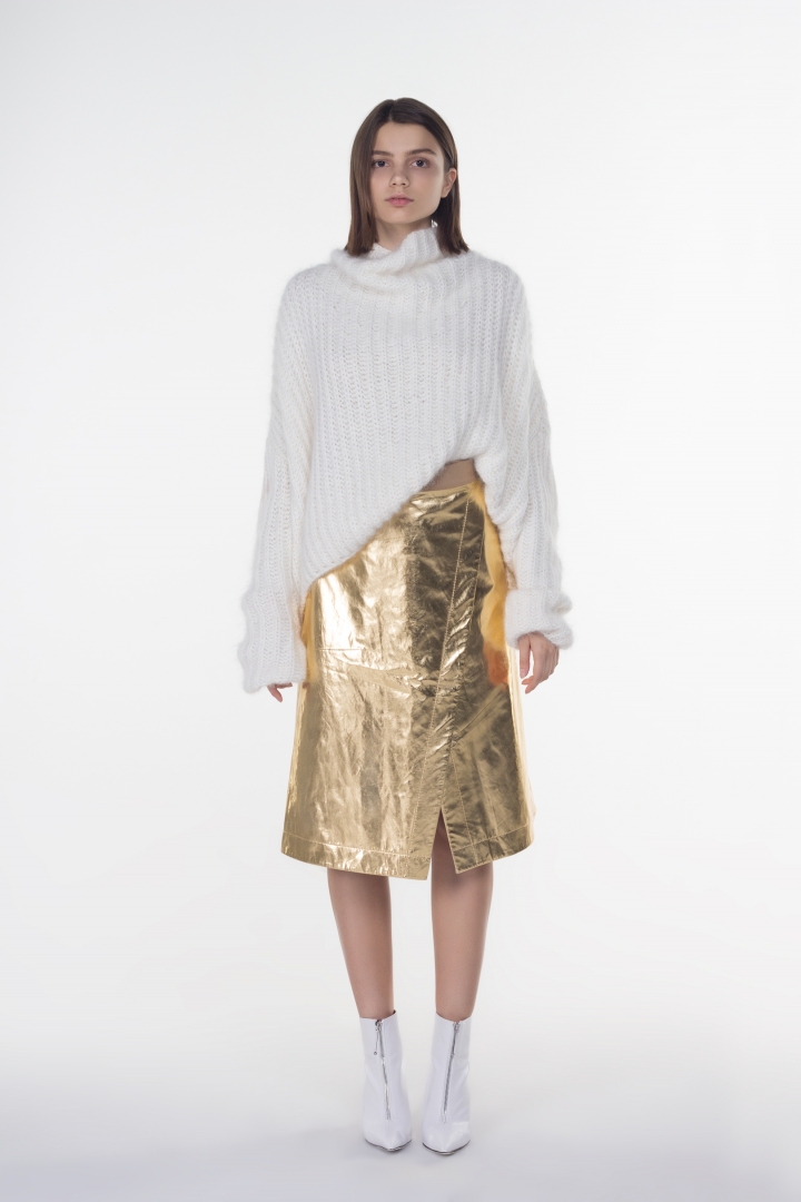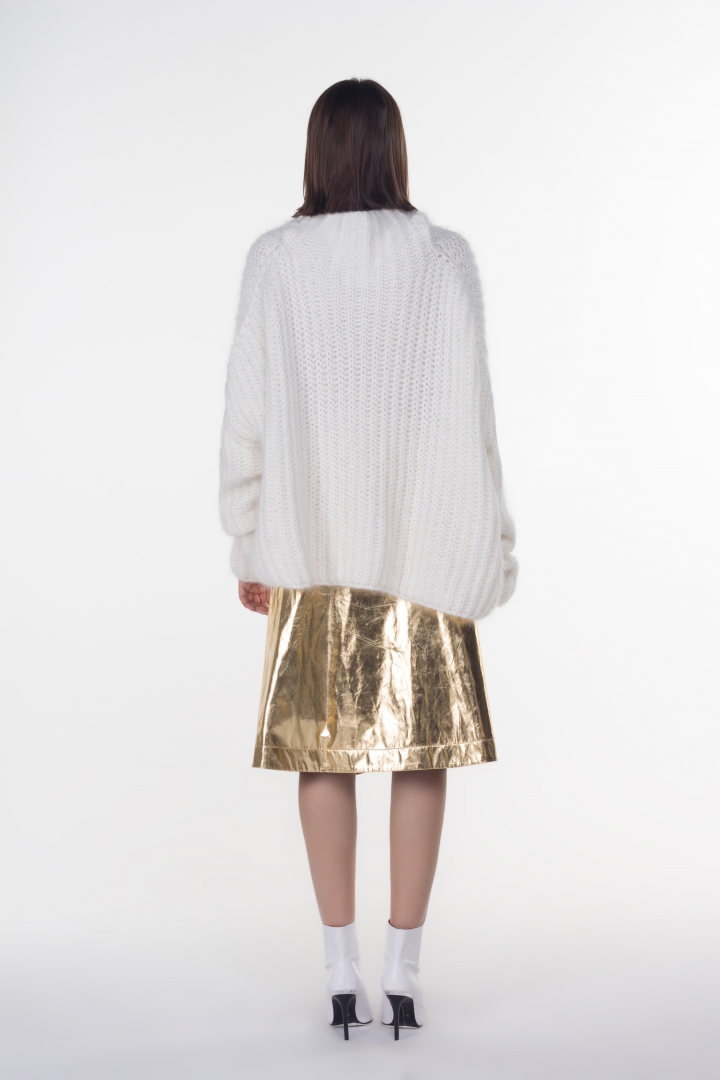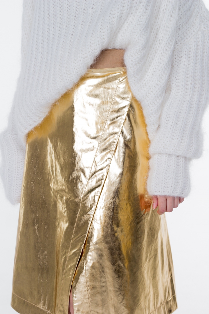 The golden color is the ace of the fashionable palette. The A-line skirt favorably emphasizes the dignity of the female form, making the silhouette look elegant. Golden metallics impart originality and luxury. Unique in its composition, staying beautiful and warm is assured! With this skirt, you can reach the pinnacle of the socialite world.