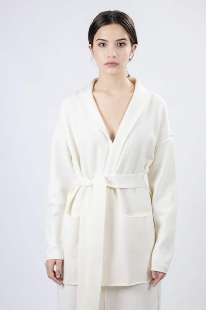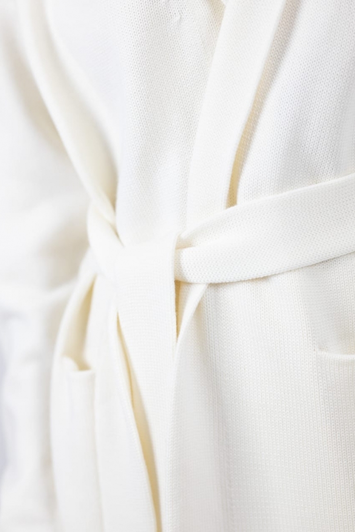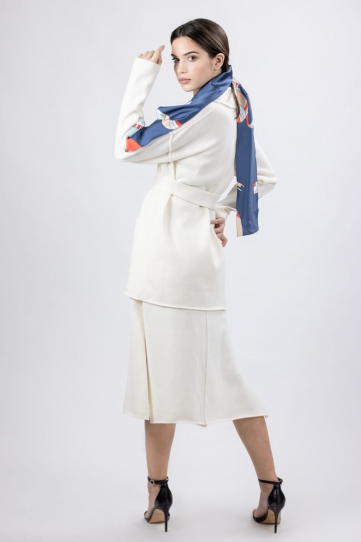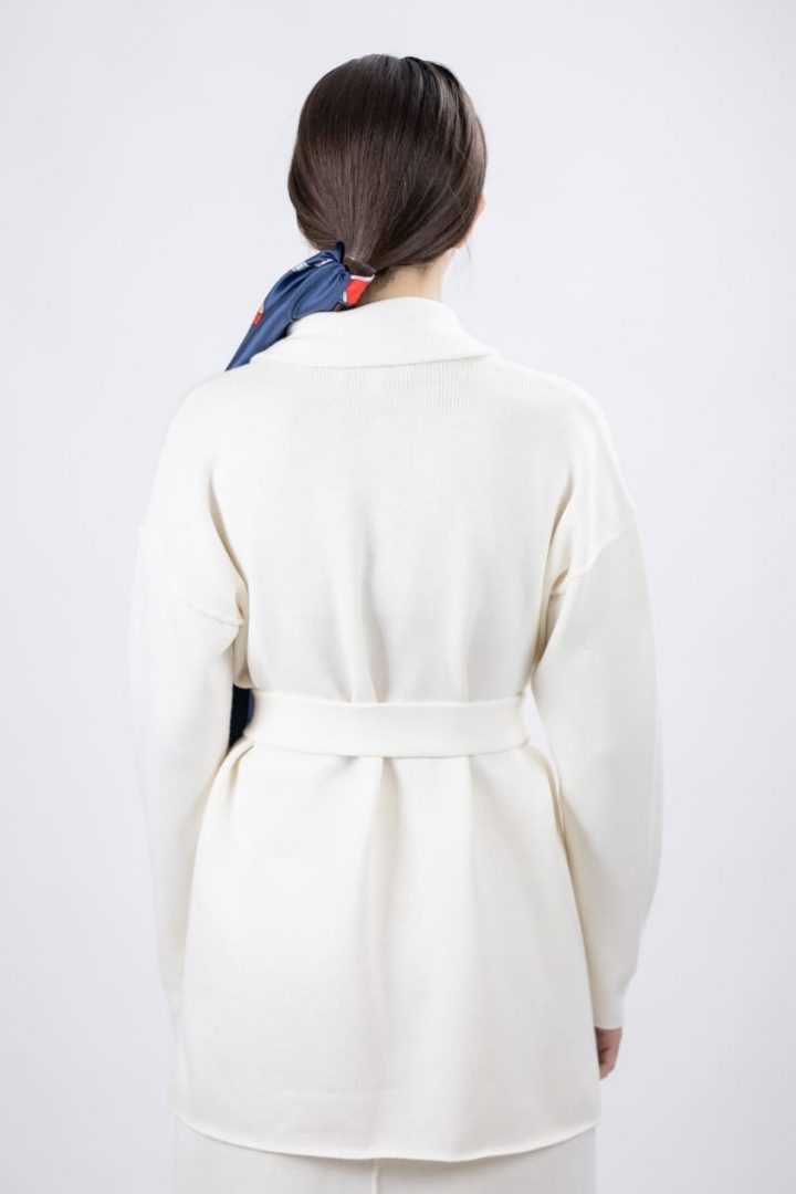 Stylish, knitted, soft touch to the body jumper milky colour is the hit of the season of fall-winter 2019/20. Medium thickness of the knitting, the belt that underlines the shape of the waist and practical shape - is the key for a stylish look, and 100% of the merino wool in the consistency adds to it comfort and freedom. The item can be purchased as individual or with a gorgeous skirt from the same look. Both of the items will make a harmony of the look as a pair.