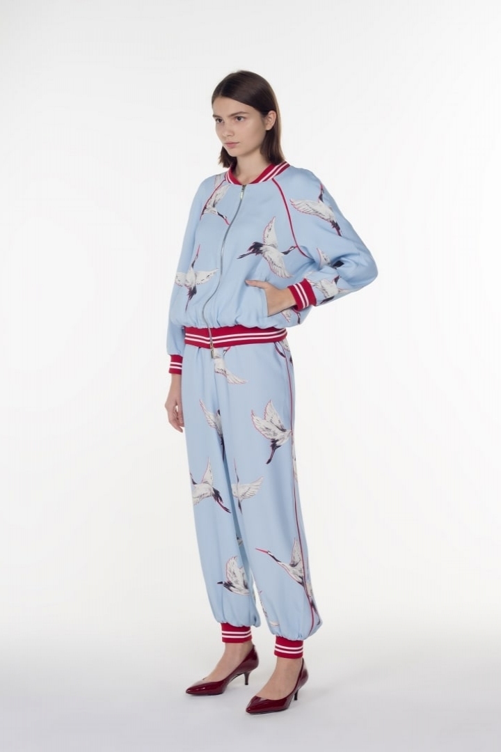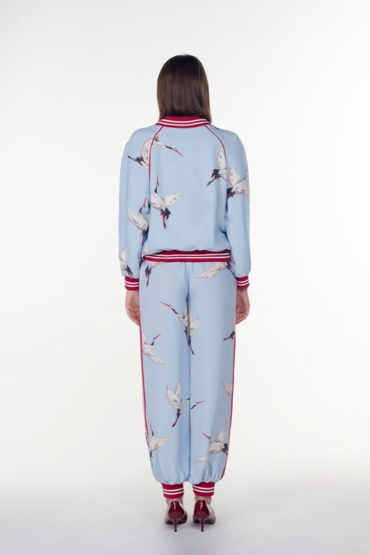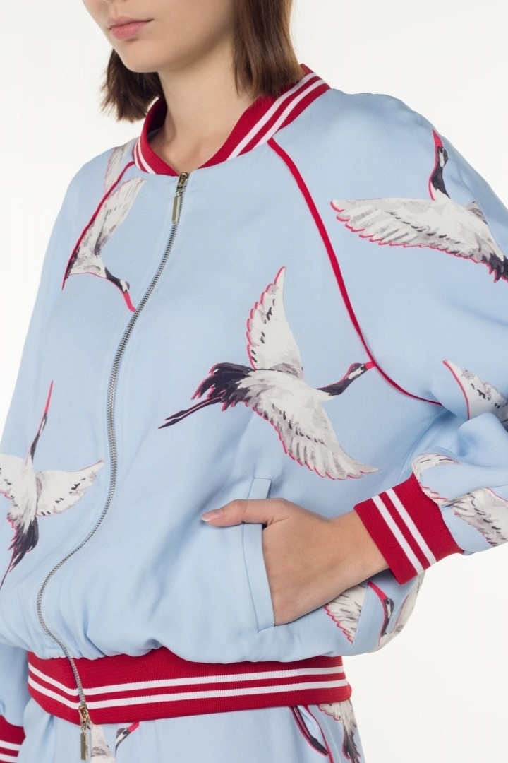 El bomber irrumpió en la industria de la moda con descaro y confianza. Logró captar la atención de los gurús de la pasarela y se convirtió en el éxito absoluto de la temporada otoño-invierno de 2018. En la década de 1930, estas cazadoras fueron hechas exclusivamente para hombres y se incluyeron en el elemento obligatorio de ropa para pilotos. Hoy en día, una cazadora bomber es una prenda imprescindible para cada fanático de la moda. La seda azul de lujo y el estampado de cigüeñas, que parecen flotar, van a darle a su imagen feminidad e independencia.