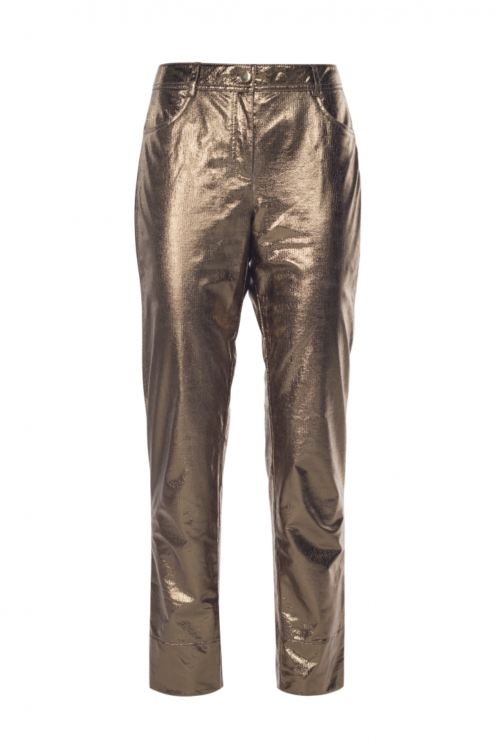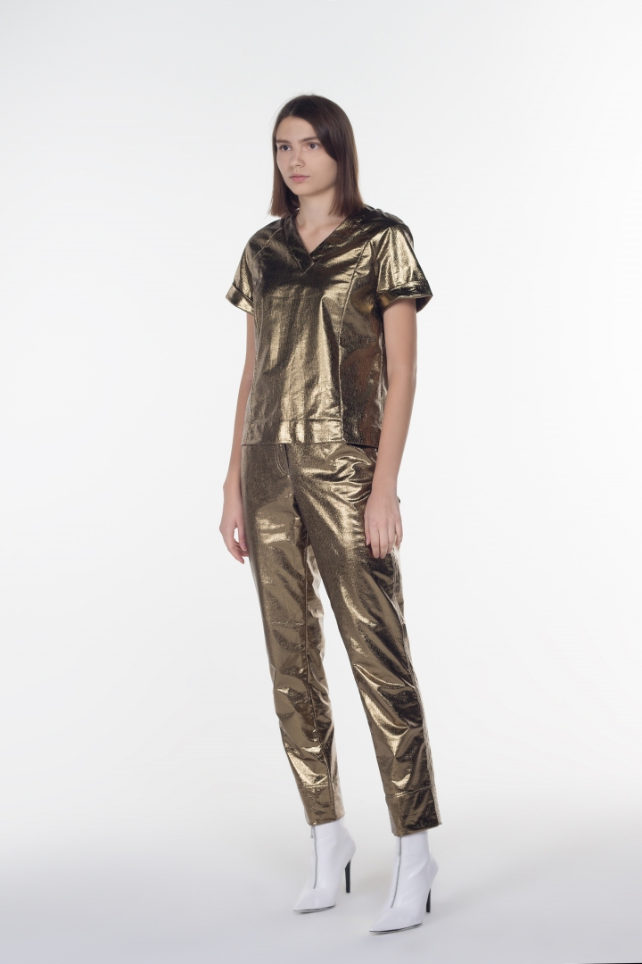 La pasarela de moda dicta las reglas cada temporada. Las tendencias están cambiando, pero un clásico de lujo solo cambia la forma de su presentación. Los pantalones en color dorado oscuro llamarán su atención. El refinado color dorado fue transformado por la nobleza. El tono único convierte instantáneamente a una personalidad brillante en una verdadera reina. El 50% de algodón los hace extremadamente cómodos de llevar. La colección tiene en stock el mismo top original.