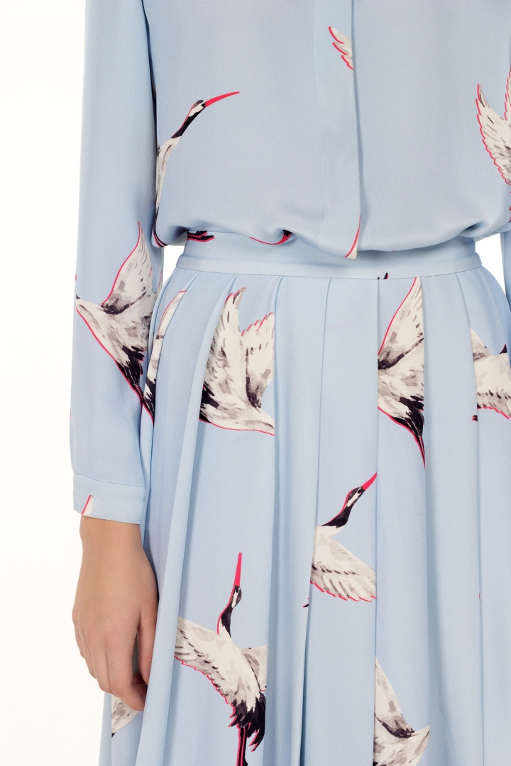 Falda de diseño celeste con cigüeñas de alas blancas flotando libremente en los espacios abiertos. Este diseño original distingue a la marca KORSUN del resto. La dueña de tal obra maestra no solo es bella, sino también intelectual. Las cigüeñas son un símbolo de libertad interior y sabiduría. Gracias a la seda 100% de lujo, la falda tiene brillo, suavidad y durabilidad únicos.