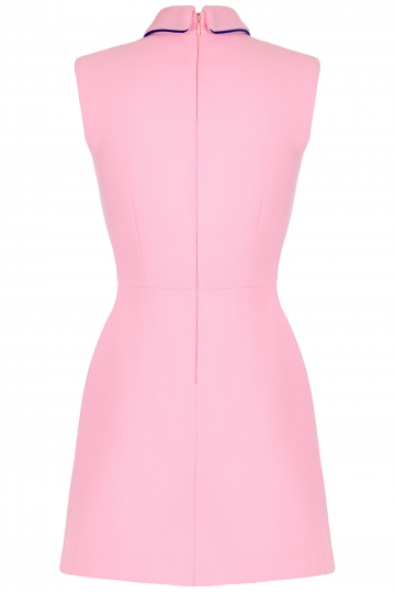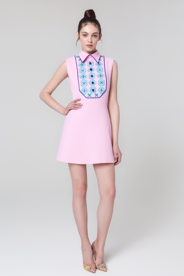 Мини-платье Корсун без рукавов, сшитое из двойной шерстяной ткани. Верхняя передняя часть платья покрыта многоцветной вышивкой. Застежка-молния в задней части платья. Присутвует также контрастная цветовая деталь вокруг нижнего края воротника.