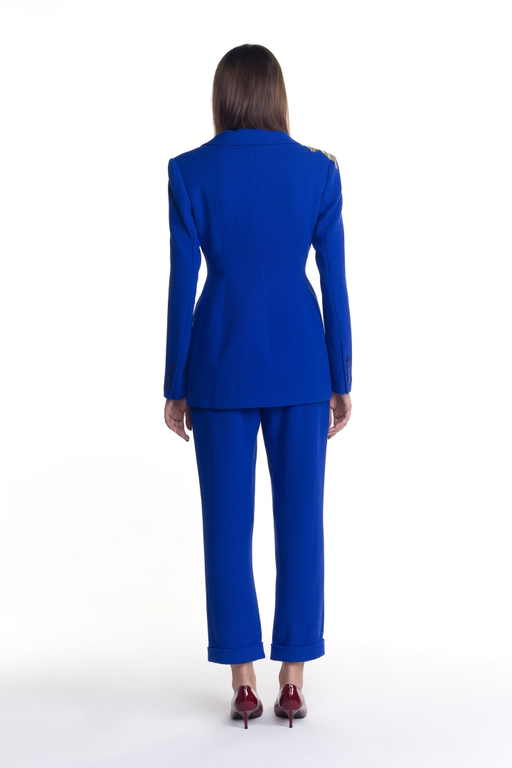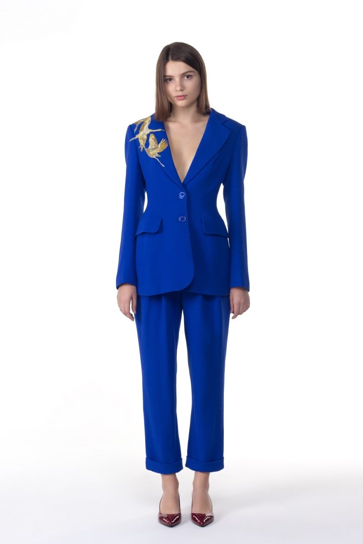 Оригинальный пиджак цвета электрик с эксклюзивной вышивкой, при создании которой используется 20 000 стежков немецкой шелковой золотой нити. Благодаря натуральному составу, а именно 100% шерсть, пиджак идеально подходит для холодного времени года. Яркая модель с парящими журавлями станет отличным дополнением для стильного лука и никого не оставит равнодушной.