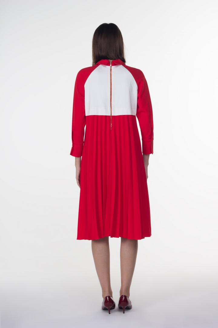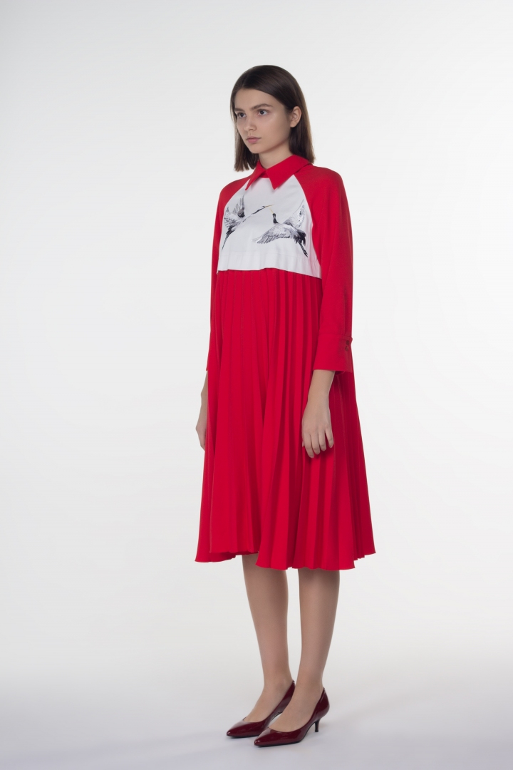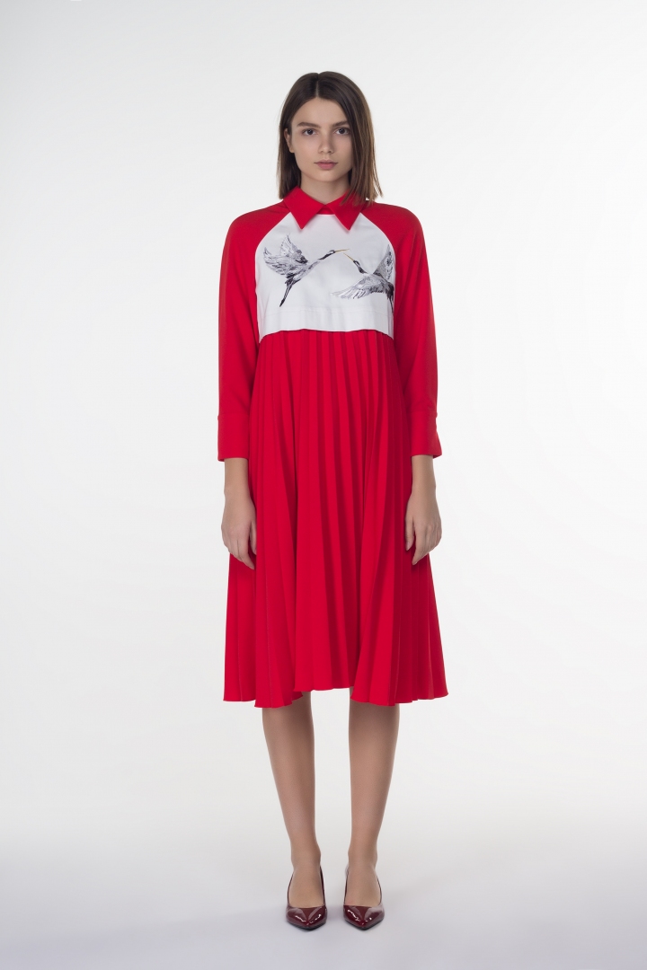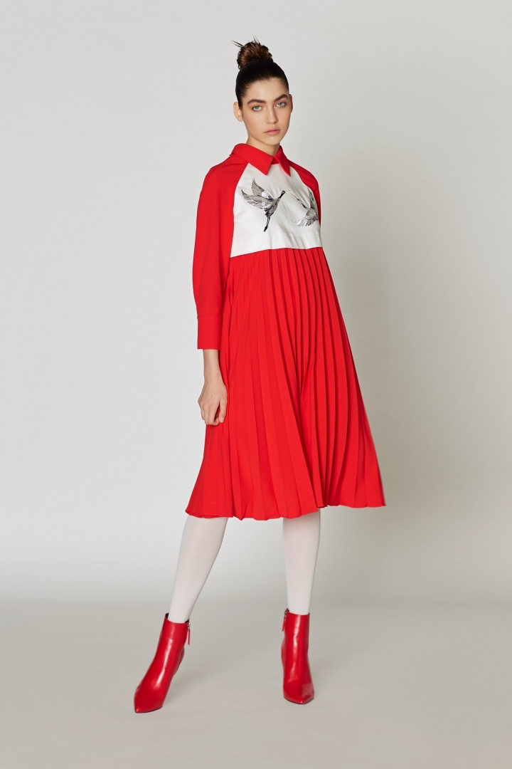 Оригинальное дизайнерское платье для современной стильной женщины. Красный цвет всегда в тренде, он придает модели дерзости и яркости. Фирменная вышивка в виде птиц, плиссировка и воротник с острыми углами сделают образ эксклюзивным. Необычная форма платья имеет особую притягательность в мире ценителей моды.