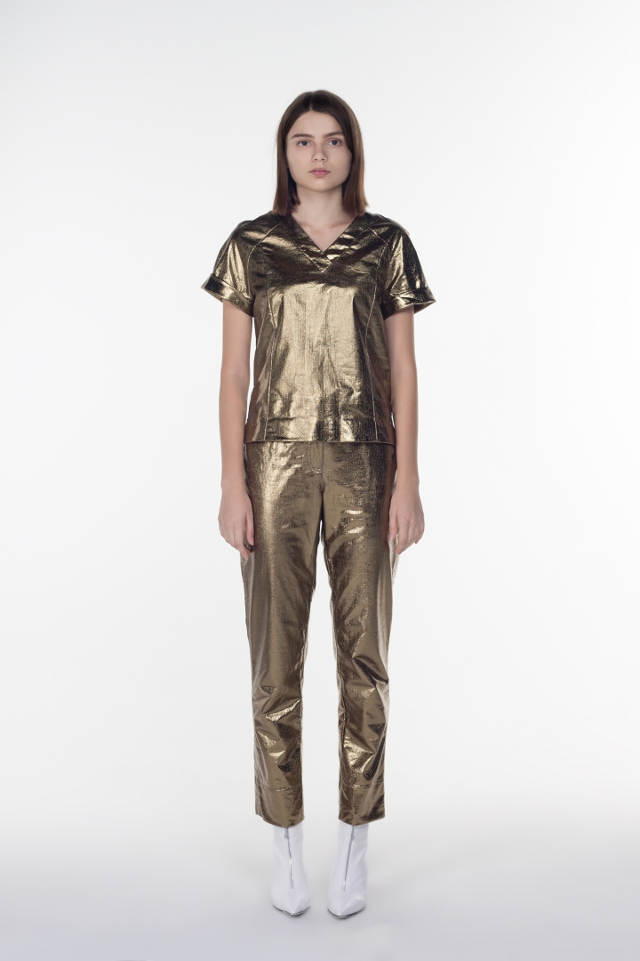 Эпатаж это всегда роскошь на грани, определённый вызов обществу. KORSUN предлагает влюбить в себя окружающих с помощью топа в цвете тёмное золото. Благородство этого оттенка превосходит все ожидания. Изделие легко комбинируется с повседневными брюками/джинсами, юбками. В наличии коллекции также изготовлены брюки в тёмном золоте. Такой комплект безупречно подойдёт для светского мероприятия или торжества.