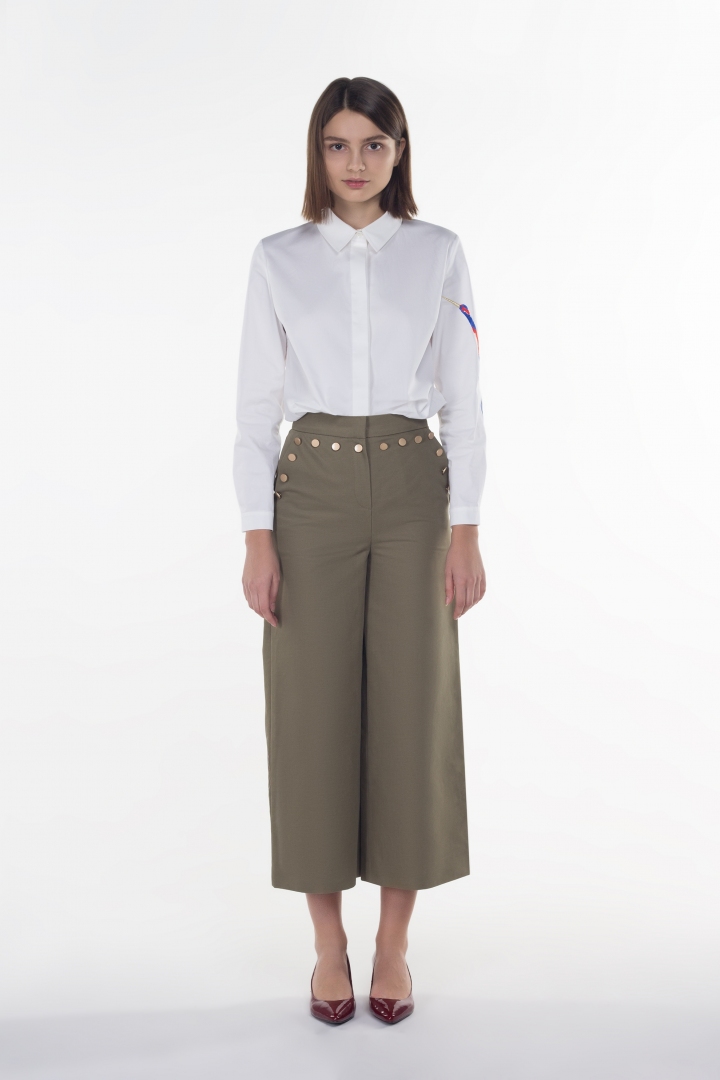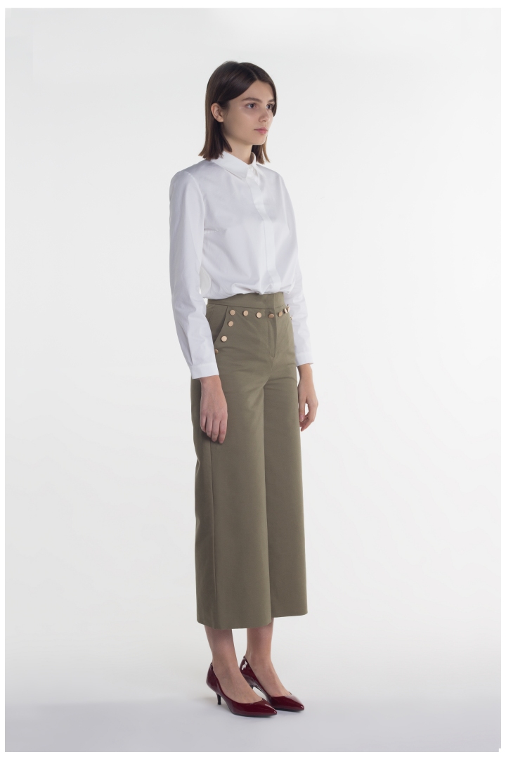 Брюки-кюлоты это 100% попадание в тренд сезона 2018-2019. Кюлоты это универсальное решение для модниц. Они выгодно смотрятся на женщинах с абсолютно любыми формами, поскольку свободный крой скрывает все недостатки фигуры и делает ее более изящной. Цвет хаки обеспечит идеальный образ в стиле smart casual. В сочетании с ярким верхом брюки приобретают ещё более фешенебельной привлекательности.