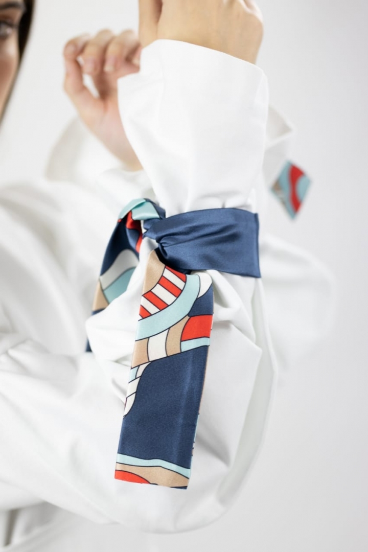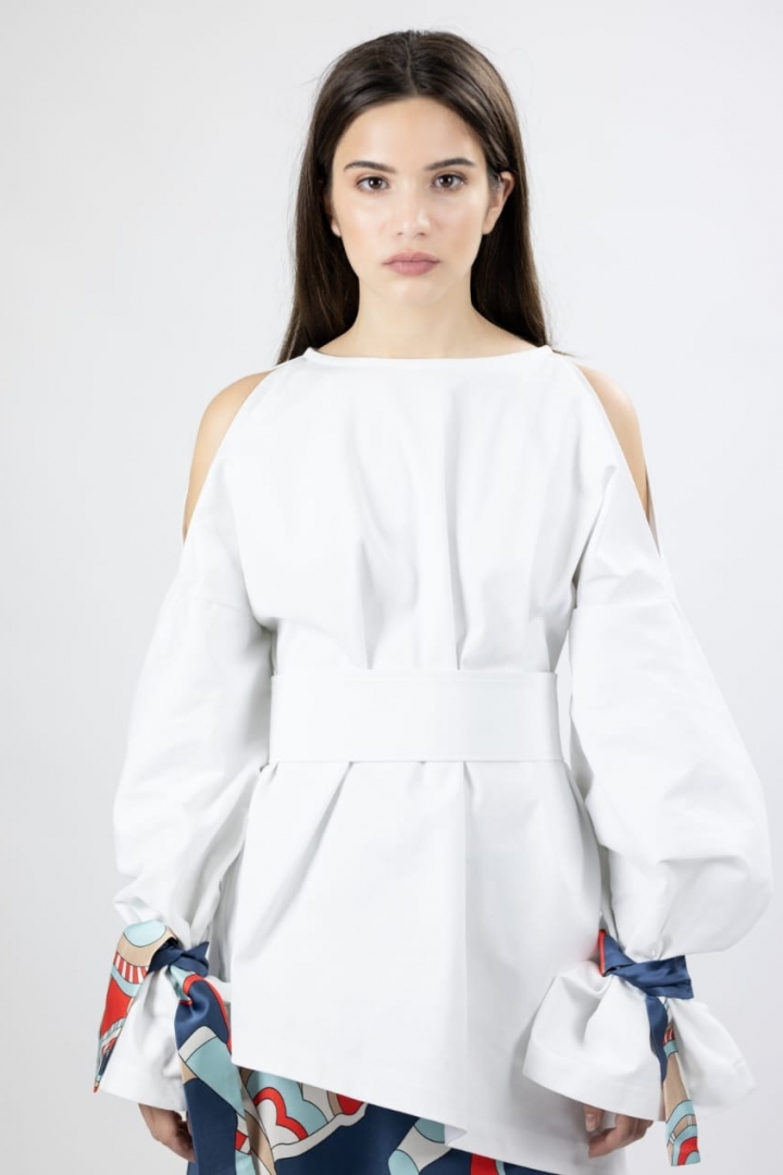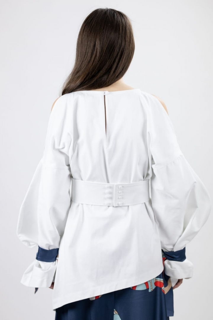 Ассиметричная рубашка с открытыми плечами добавит в ваш образ смелости. Эксклюзивный дизайн, принтованные темно-синие шёлковые ленты на рукавах, широкий пояс, подчеркивающий талию сделают ваш лук стильным. Натуральный плотный 100% хлопок обеспечит максимальный комфорт в носке. Рубашку можно легко сочетать, как с длинными юбками, так и с любыми брюками или джинсами.